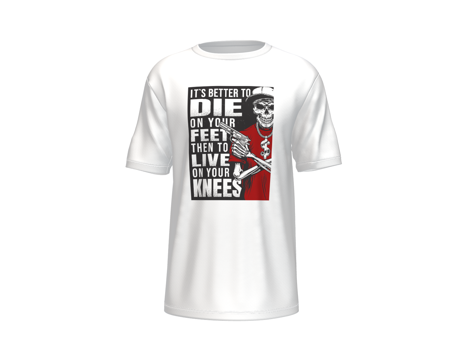 Make a bold statement with this eye-catching graphic T-shirt. Crafted from comfortable white fabric, the shirt features a striking design of a skeleton in a red outfit, set against a contrasting black, white, and red background. Prominently displayed is the powerful slogan: “It’s better to die on your feet than to live on your knees.” The high-impact typography and vivid artwork make this tee perfect for anyone who values courage, individuality, and speaking out. Ideal for pairing with jeans or casual wear, this shirt is designed for those who aren’t afraid to stand up for what they believe in.